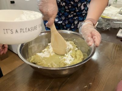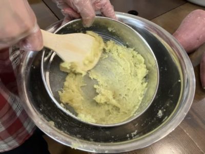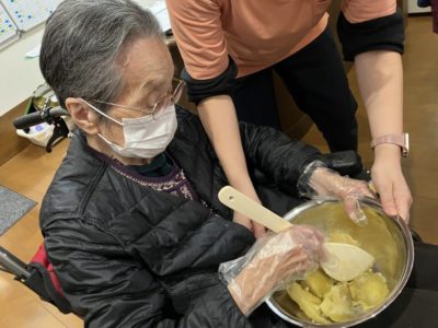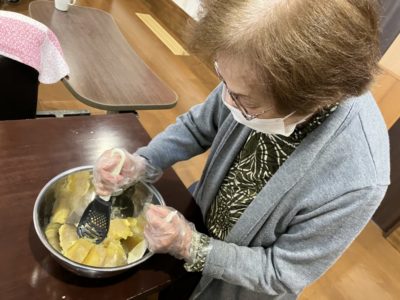 蒸し終わり、皮をむいたものをご利用者様に潰して頂きました~‼