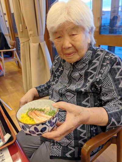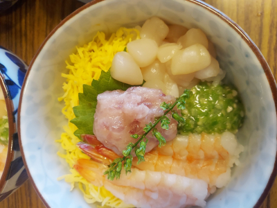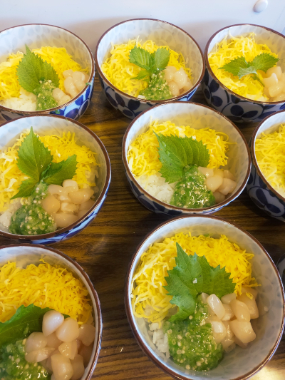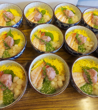 石見神楽の演目に「恵比寿」に因んで、海の幸を詰め込んだ丼、「えびす丼」