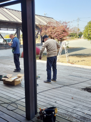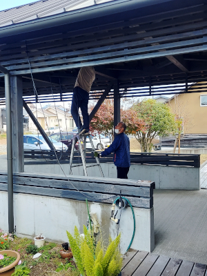 電源確保から始めます。電源を伸ばして電飾場所へと運びます。
