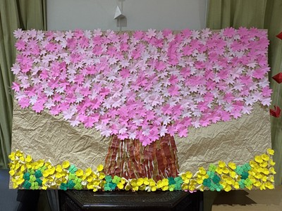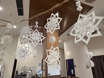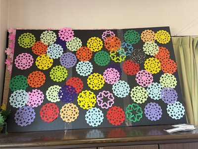 皆さんで折り紙を折って切って好きなように貼り付けてみました。