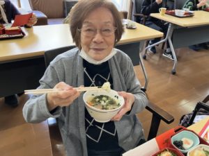 お雑煮は餅の代わりに『餅風ムース』が入っていましたが「美味しいね」と召し上がられていました。