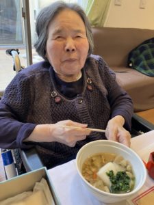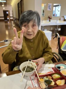 「美味しそうね~。」「こら、なんな?」と利用者さん同士で話したり職員に話掛けられたりと楽しそうに召し上がられていました。