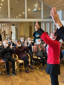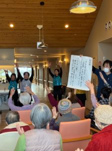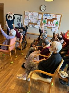 炭坑節や北国の春などの昭和歌謡に合わせて、体を動かす動作があり、利用者様も笑顔で