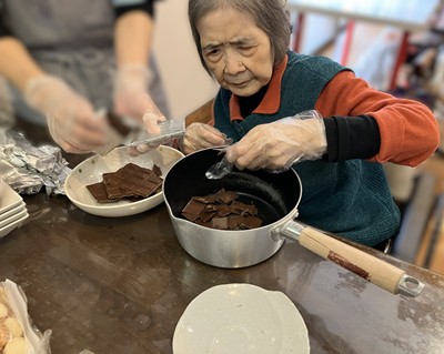 ご利用者様にチョコを割るのを手伝って頂き鍋に入れ、牛乳を入れてもらいました。