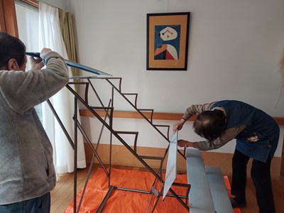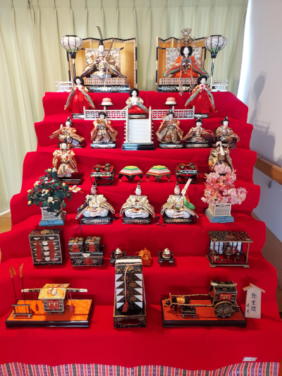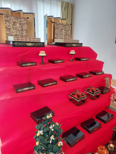 7段の階段が出来たところで赤い布「緋毛氈」を敷いていきます